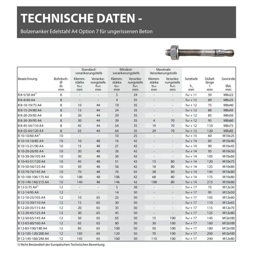 Der Bolzenanker Edelstahl A4 ist dank seiner Zulassung, für ungerissenen Beton geeignet und ist eine zeitsparende Durchsteckmontage.