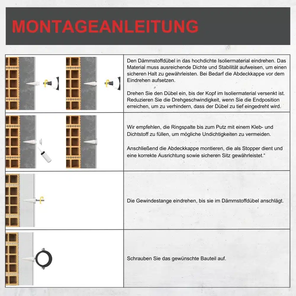 Wir empfehlen, vor der Montage der Abdeckkappe die entstandene Ringspalte zwischen Dübel und Fassade bis zum Putz mit einem Kleb- und Dichtstoff zu füllen, um mögliche Undichtigkeiten zu vermeiden. Hierzu empfehlen wir unseren Hybrid-Montagekleber.