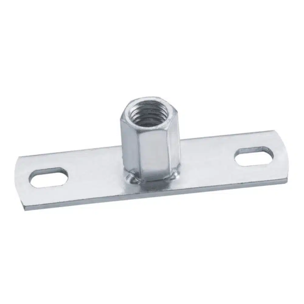 Die aufgeschweißte Mutter mit metrischem Innengewinde ermöglicht eine direkte und stabile Verbindung mit der passenden Gewindestange. Zwei seitliche Langlöcher sorgen für eine flexible, präzise Ausrichtung und einfache Montage mittels Schrauben oder Dübeln. Die kompakte, flache Bauweise gewährleistet eine unauffällige Installation bei gleichzeitig optimaler Lastverteilung.