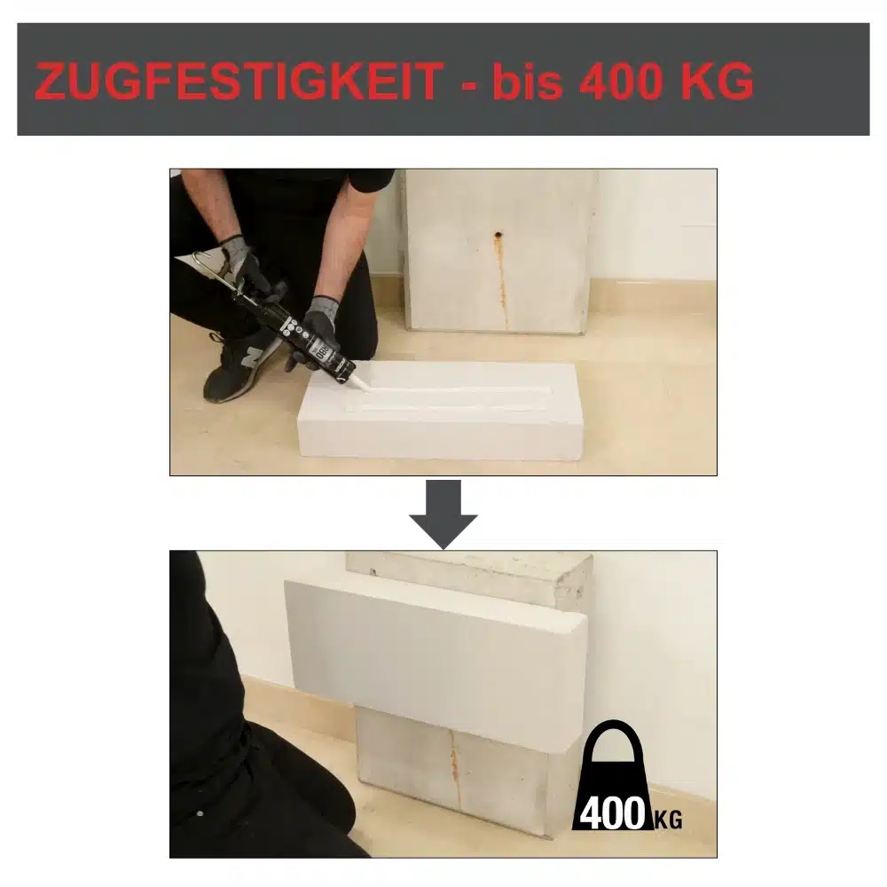 - Hervorragende Haftung auch auf nassen Oberflächen und sogar unter Wasser