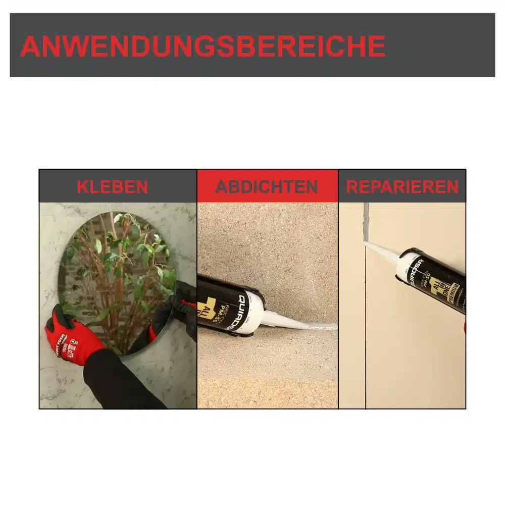 Darüber hinaus ist unser Hybrid Montagekleber beständig gegenüber Feuchtigkeit, UV-Strahlung und Temperaturschwankungen. Damit eignet er sich perfekt für langlebige Abdichtungen selbst unter härtesten Bedingungen.