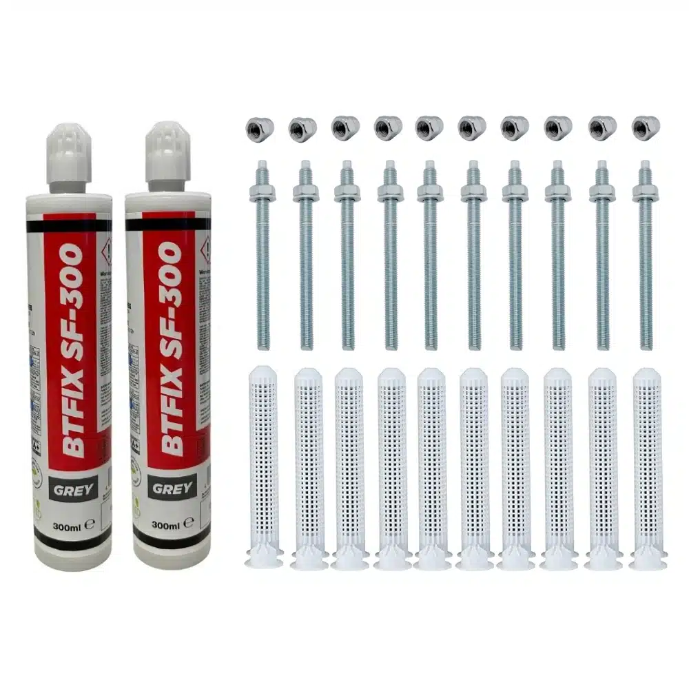 BTFIX Schwerlast-Montageset mit Injektionsmörtel SF Option 7 inkl. Statikmischer, Ankerstangen verzinkt, Siebhülsen und Hutmuttern verzinkt